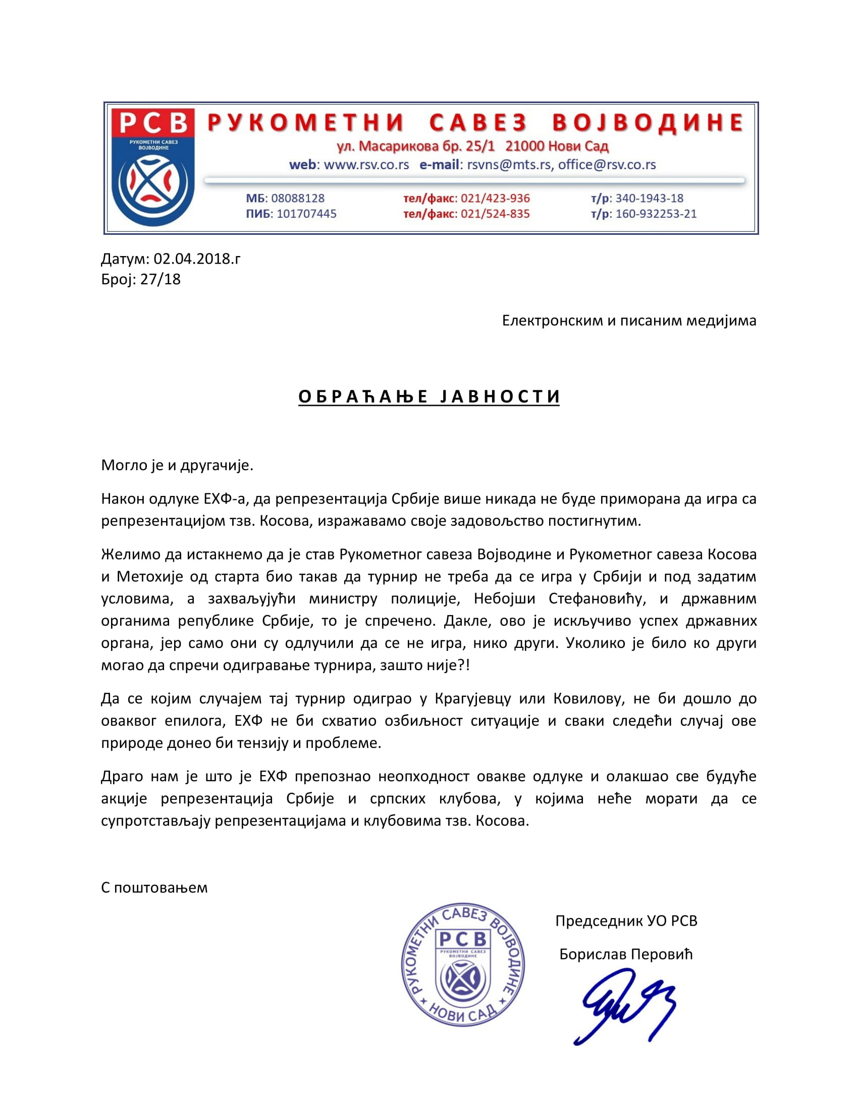 Након одлуке ЕХФ-а, да репрезентације Србије и српкси клубови неће више морати да се састају са репрезентацијама и клубовима тзв....