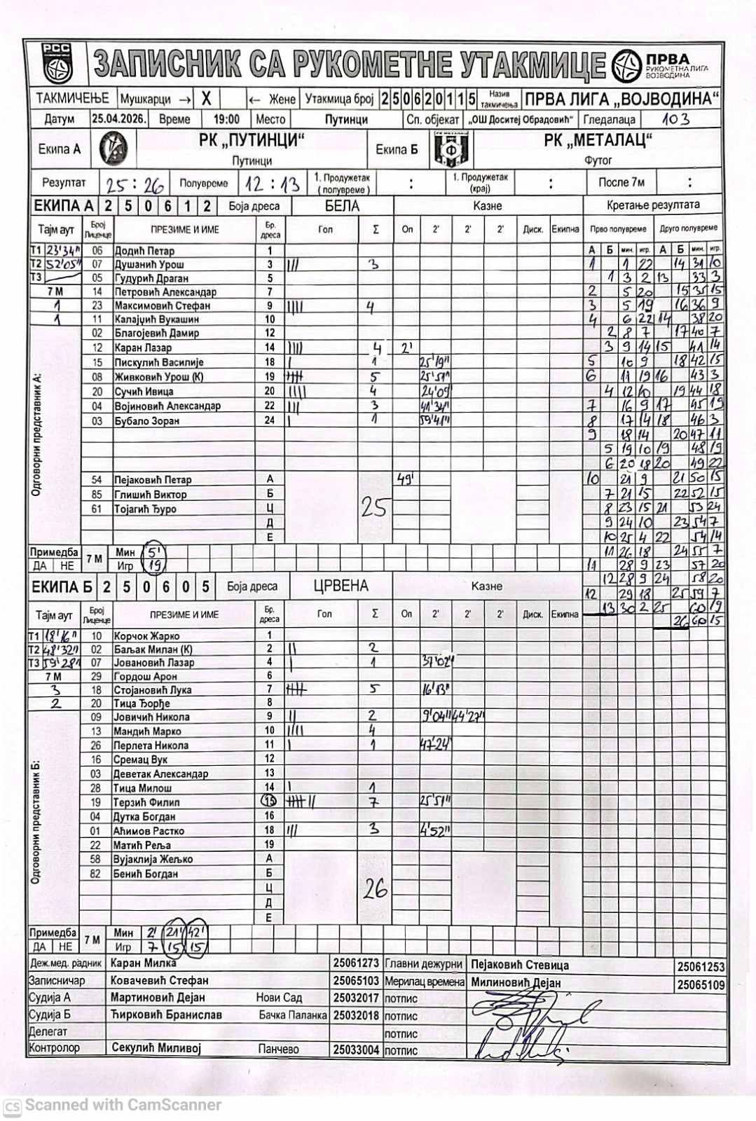 А судија: Дејан Мартиновић Б судија: Бранислав Ћирковић Контролор: Миливој Секулић |