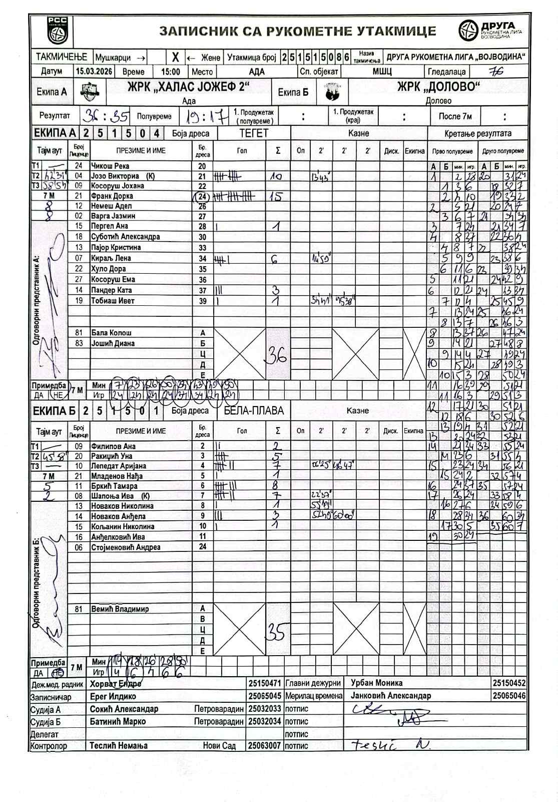 А судија: Александар Сокић Б судија: Марко Батинић Контролор: Немања Теслић |