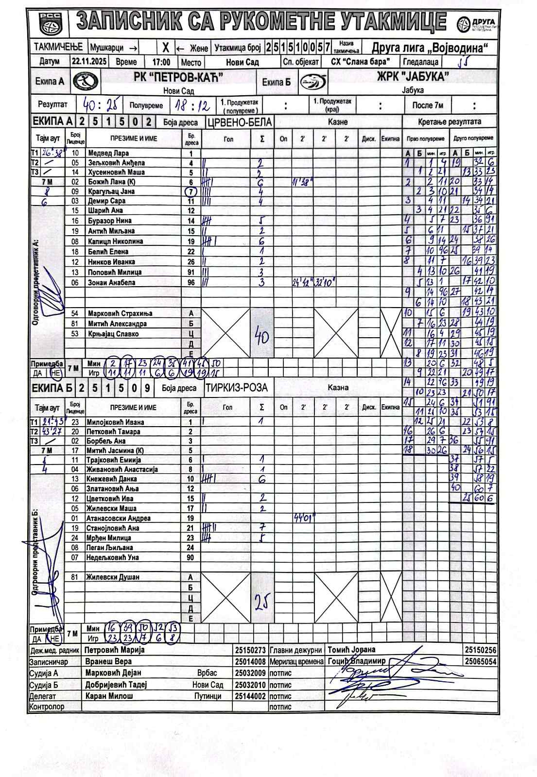 А судија: Дејан Марковић Б судија: Тадеј Добријевић Делегат: Милош Каран |