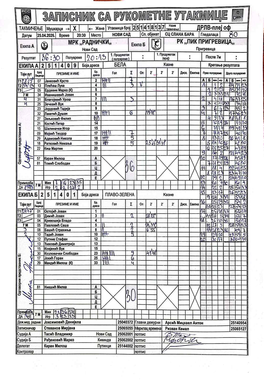 А судија: Владимир Тасић Б судија: Марко Рађеновић Делегат: Милош Каран |