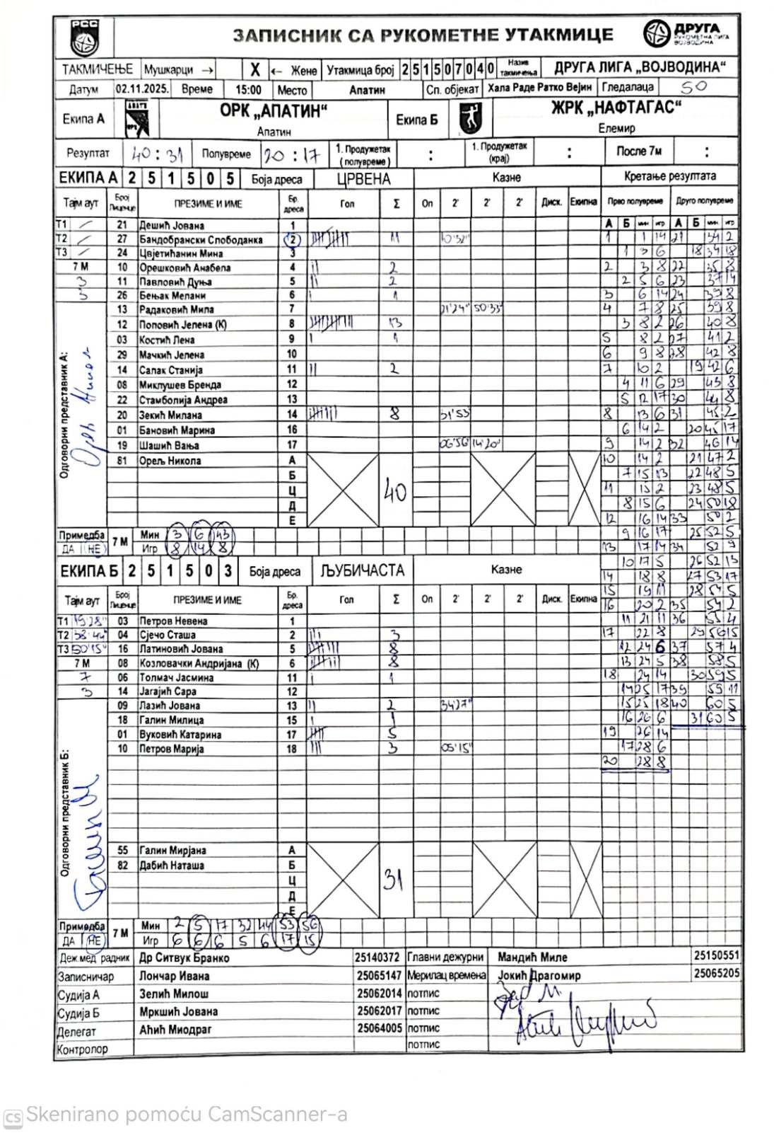 А судија: Милош Зелић Б судија: Јована Мркшић Делегат: Миодраг Аћић |
