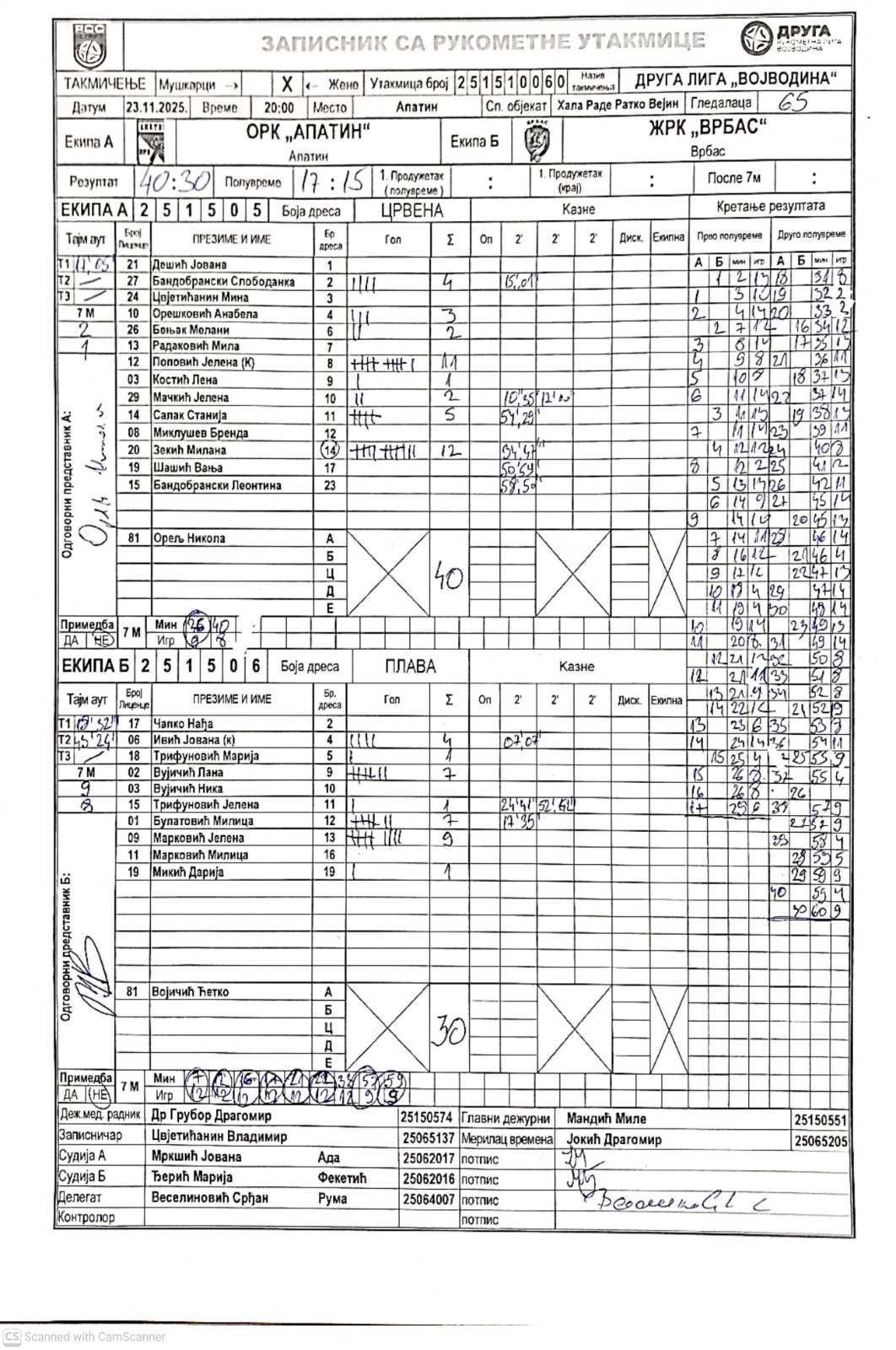 А судија: Јована Мркшић Б судија: Марија Ђерић Делегат: Срђан Веселиновић |