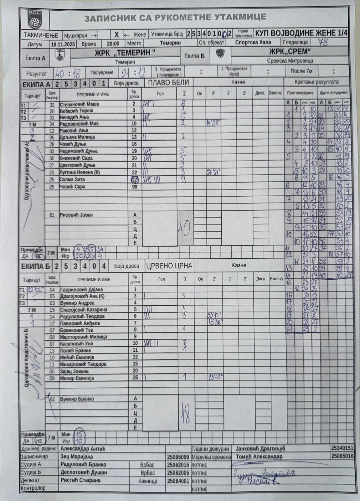 А судија: Бранко Радуловић Б судија: Душан Деспотовић Делегат: Стефана Ристић |